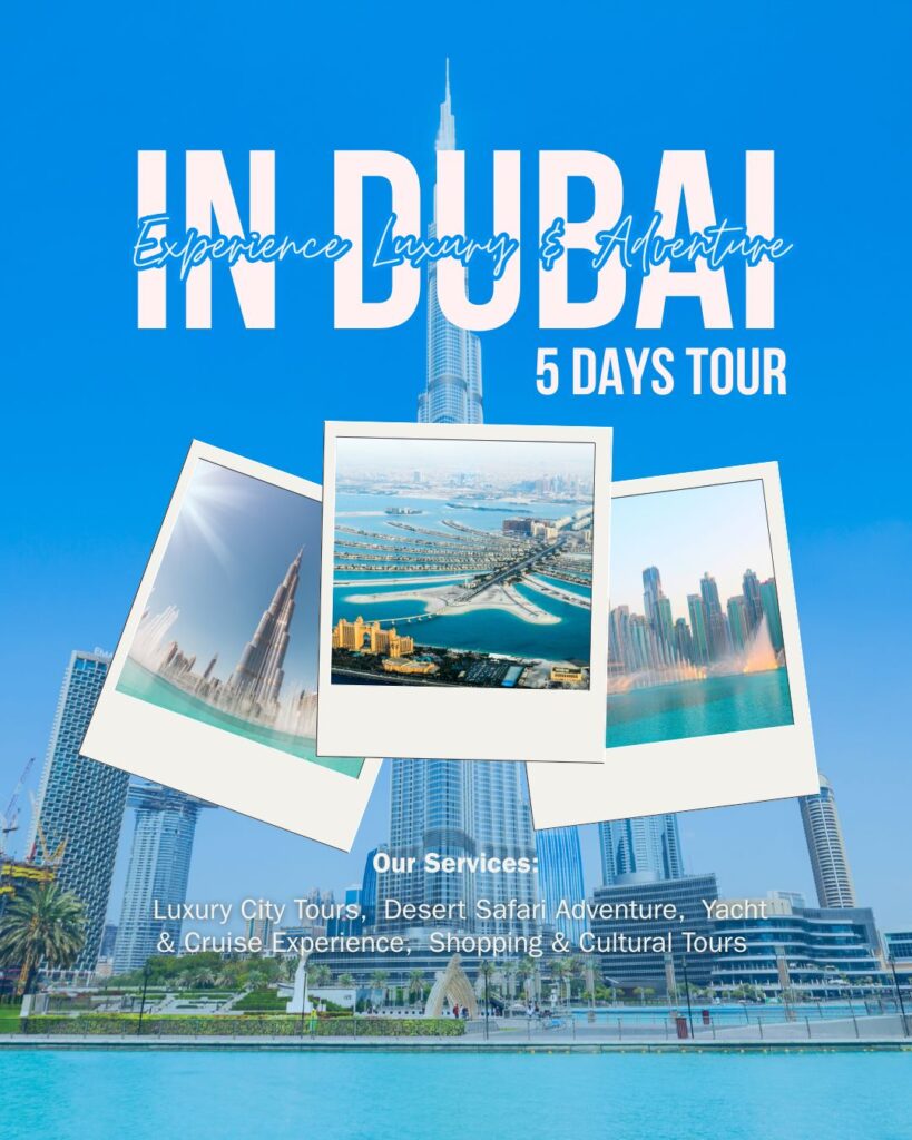 Explore the beauty of Dubai in 5 amazing days. Visit Burj Khalifa, enjoy Desert Safari with BBQ dinner, experience Marina Cruise, and discover famous attractions. Includes hotel stay, breakfast, transfers, and sightseeing. Perfect for family, couples, and friends. Book now for an unforgettable Dubai trip! ✈️🌍