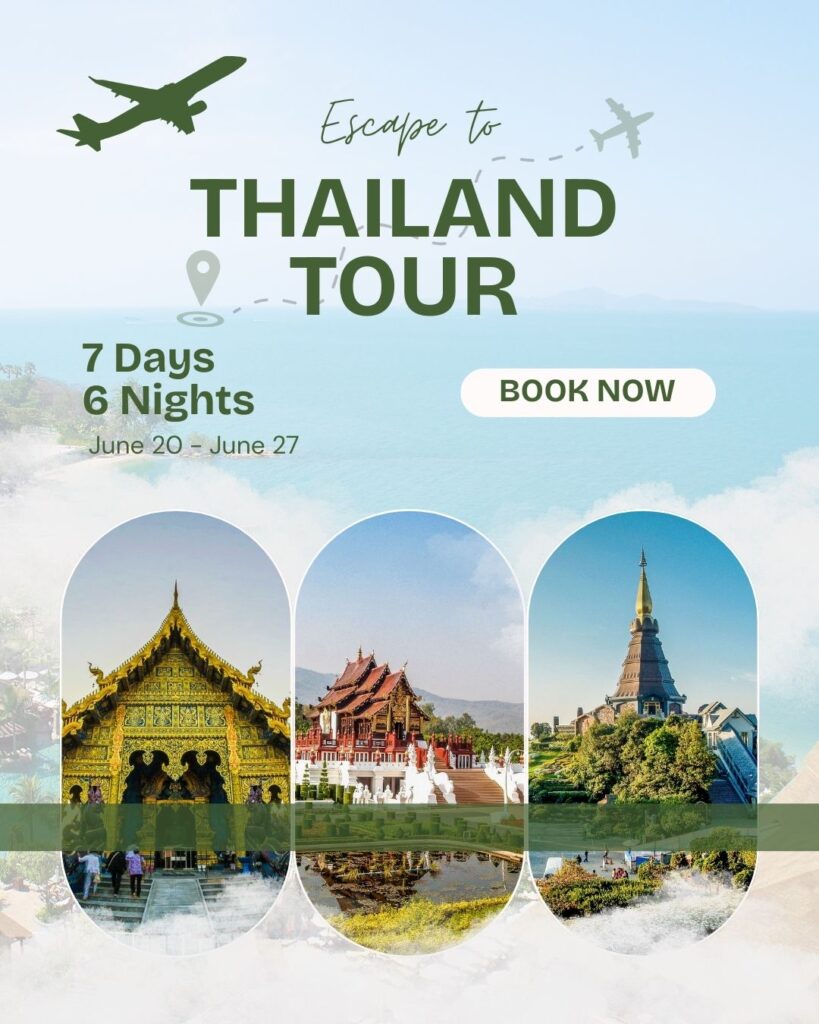 hailand Tour – 7 Days / 6 NightsEscape to beautiful Thailand and explore stunning beaches, rich culture, and vibrant city life. Enjoy comfortable stays, sightseeing tours, and unforgettable experiences.Duration: 7 Days, 6 NightsDestinations: Bangkok, Pattaya & moreTravel Dates: June 20 – June 27Perfect for couples, families & friendsBook now and make your dream Thailand trip a reality!